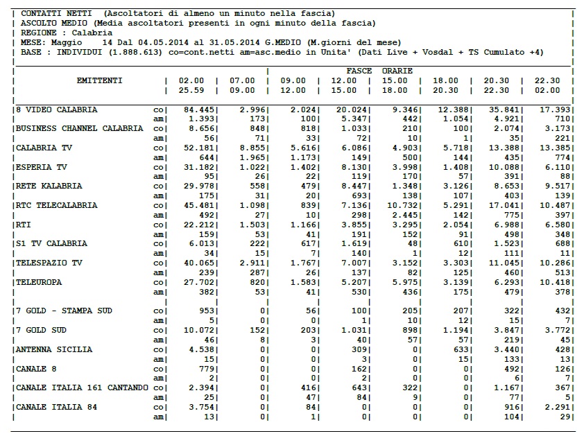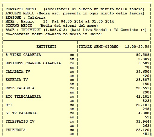 Mi rifiuto di credere che CalabriaTv abbia tra le 07.00am e le 09.00am 1965 di ascolto medio e VideoCalabria 173. Inoltre dalle 09.00am alle 12.00am 1173 di ascolto medio e al secondo posto VideoCalabria con 100!!!