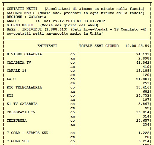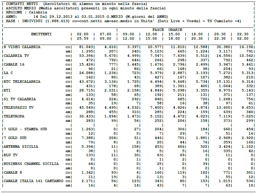 Come ogni anno pubblichiamo un estratto dei dati auditel delle emittenti calabresi relativi all’anno appena passato.