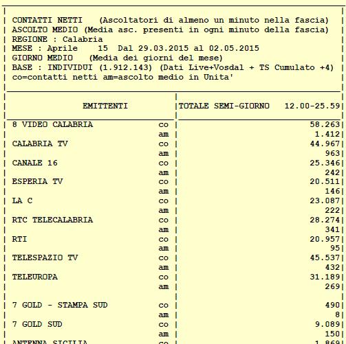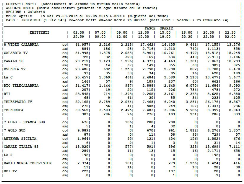 Da segnalare tuttavia un forte rialzo degli ascolti medi di Calabria TV a scapito di Video Calabria.